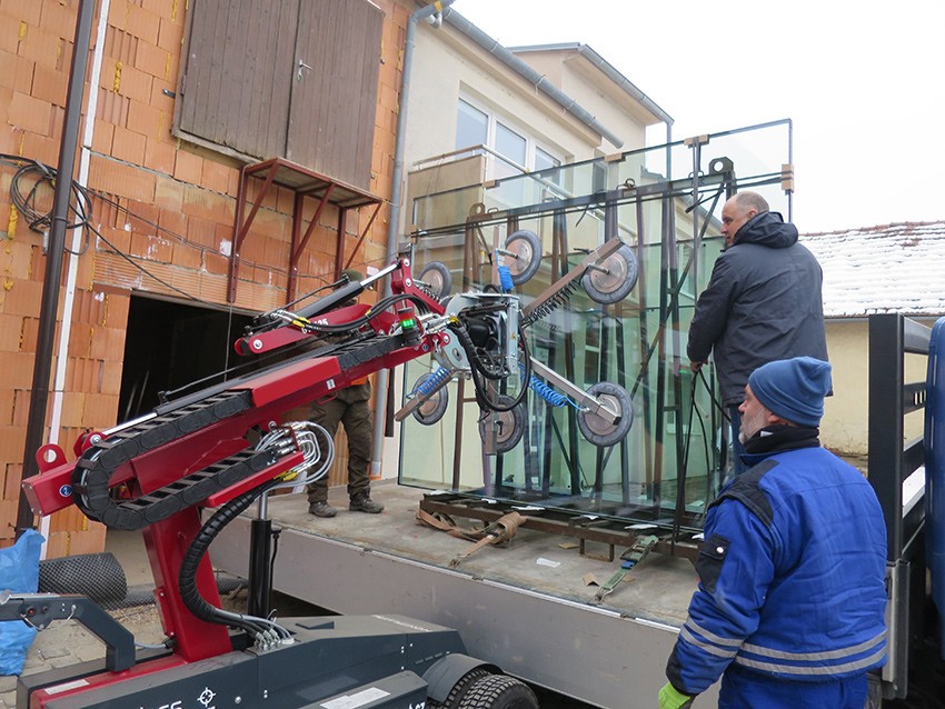 Realizace zakázky na Kroměřížsku. Zasklení probíhalo pomocí robotické ruky. Váha skla činí celých 370 kg. Okenní profil - hliníkový HS portál.
