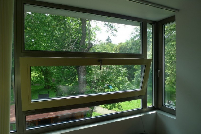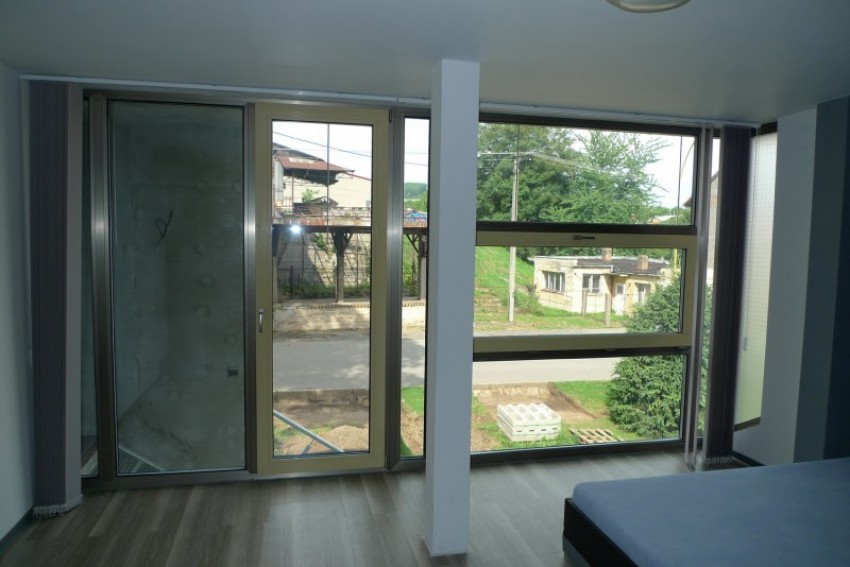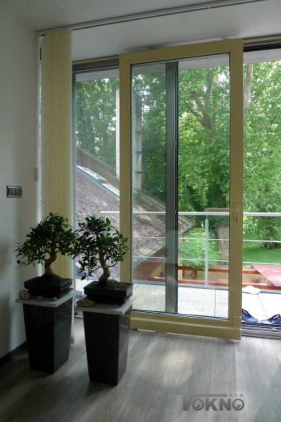 Hliníková okna a dveře v provedení rám elox - imitace leštěného nerezu a křídlo nástřik RAL slonová kost . Celková výška prosklených stěn 250cm.