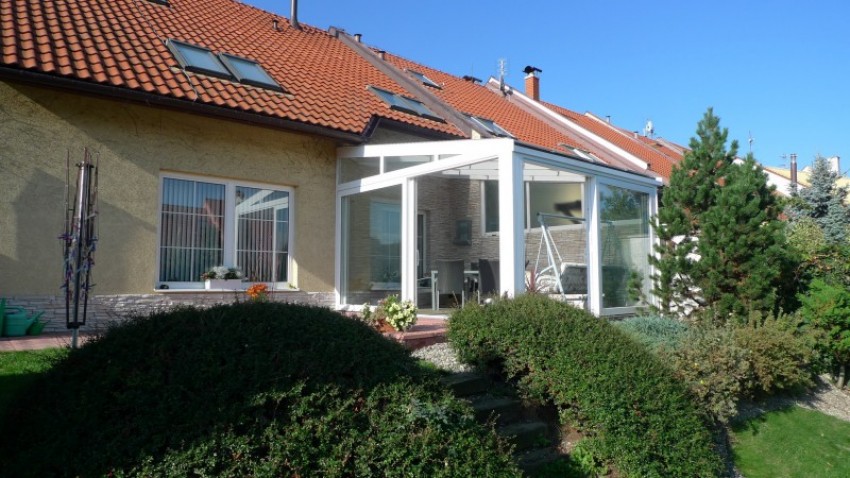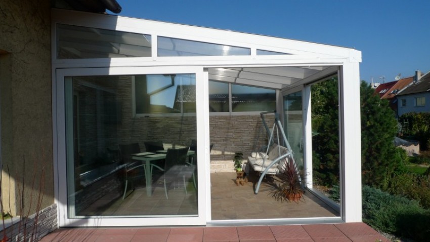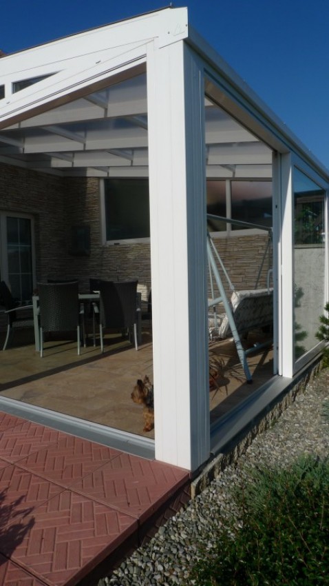 Posuvné stěny s tzv. posuvně zdvižnými dveřmi na bezbariérovém hliníkovém prahu.